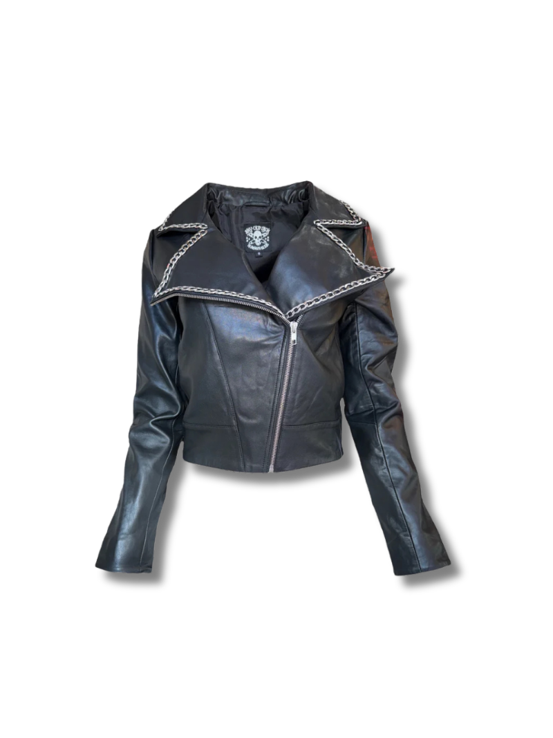 This 100% lamb leather biker jacket is adorned with a silver chain linked detailing along the collar, from the front to the back. This detail, while usually considered minimalistic in nature, elevates the jacket in a sneaky way: it refines, amplifies, and reveals the glamour of simplicity. While that feature alone may be hard to part from, the other attributes will chain you down. This jacket comes with silver hardware, a soft and flexible fit and feel, and a silky smooth interior lining. It is the perfect jacket to dress up or down, depending on the even you're wearing it to.