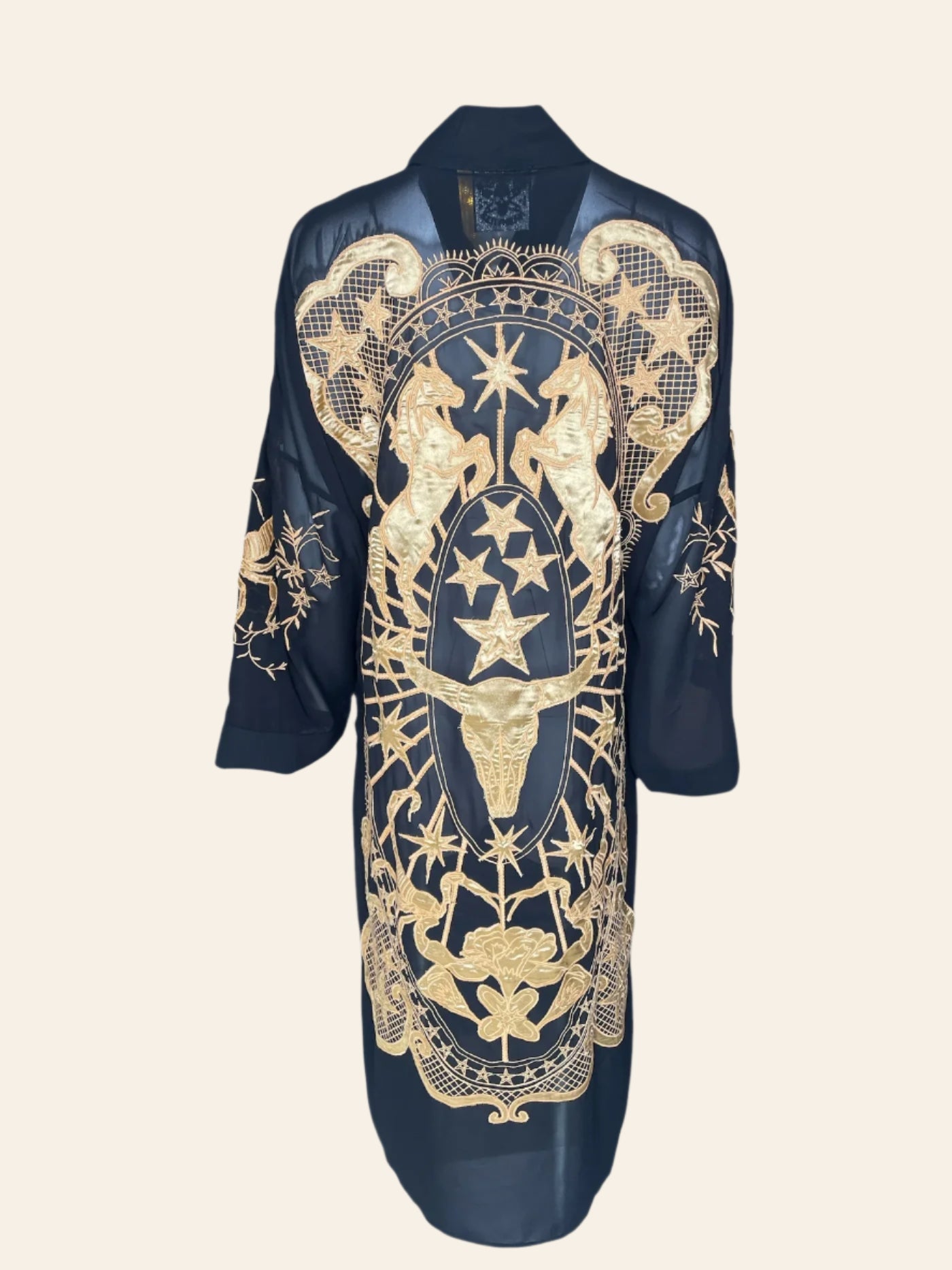 The Any Old Iron Wild Horses Duster is a 100% polyester, black garment that has been ornately decorated with golden satin detailing and embroidery. The golden design reveals mirroring horses, reared and ready to rumble; a series of stars in different sizes; a bull's head, a few scorpions, and some fauna. It is a tasteful tribute to all things wild, both in the west and on the other side of this screen. It is the perfect outer layer for any affair, from cheering your barrel-racing niece on to attending CMA Fest.