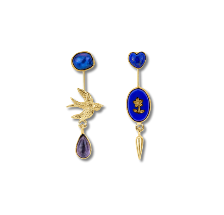 Materials: Ethically sourced 18k gold-plated silver, freshwater pearl, iolite, lapis and vintage glass.