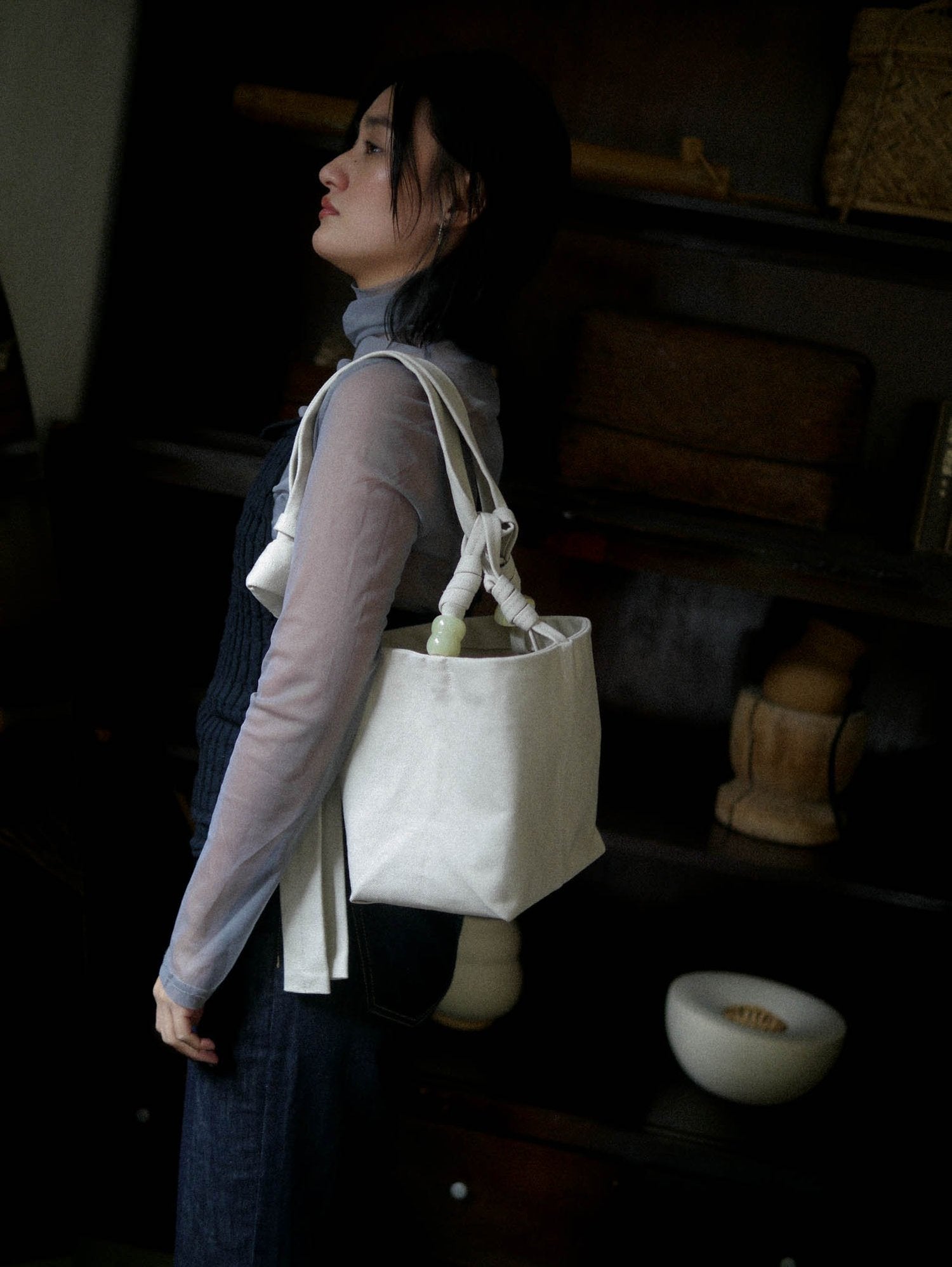 A nod to the Tafolod bag with straps that move with walking movement. A cube structure with four knots for multiple ways to use and hidden pockets on both sides. Inspired by traditional knots, jade textures, and the free-form knotting of a square-cut bag.