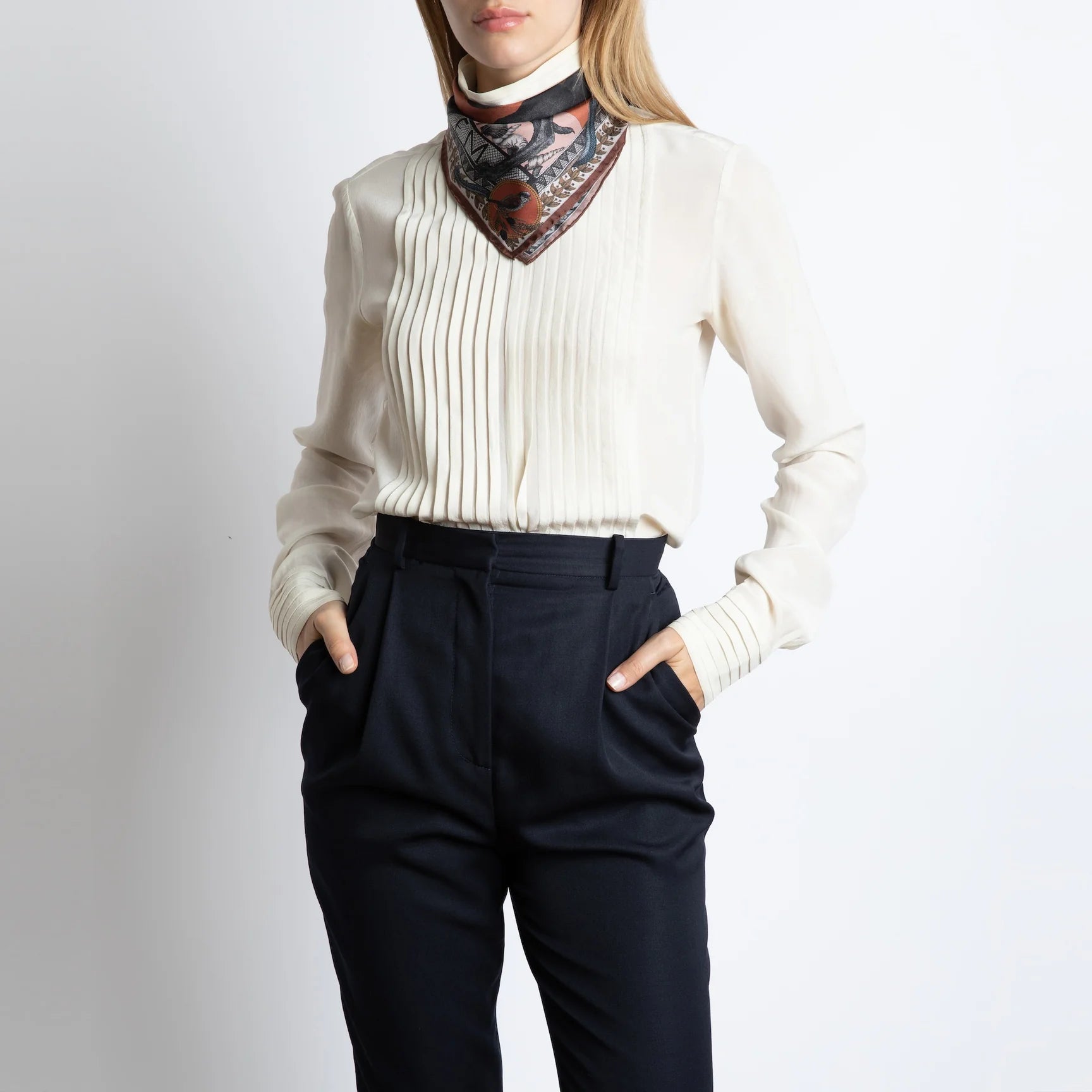 This mosaic-inspired design features an elegant Roman greyhound traversing a mosaic floor. He carries a birdcage on his back, and is surrounded by birds, olives and pomegranates, as well as a metallic laurel wreath. Our oversized silk twill scarves make for a statement scarf or an elegant wrap. Equally at home in the city or at the beach, these sumptuous 14 momme silk squares are masterfully hand fringed for a soft finish.