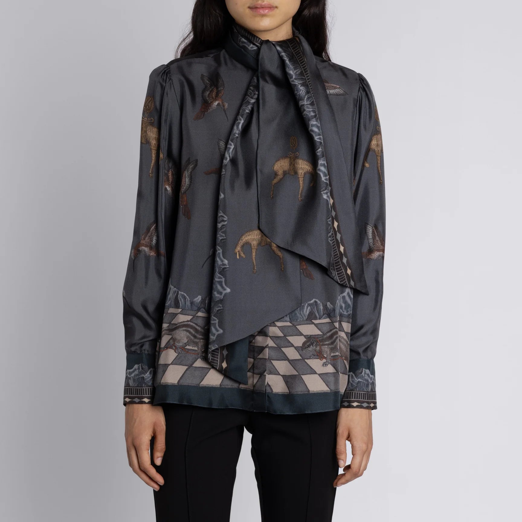 The Wolf You Feed Tie-Neck Silk Blouse draws inspiration from a wide range of sources. The wolf motif was first inspired by the incredible dioramas at the American Museum of Natural History in New York and recognises the extirpation and near-extinction of the gray wolf from the United States due to a program fuelled by human prejudice and fear. The titular phrase references an ancient Cherokee legend; every man has two wolves fighting inside of him. One is angry, greedy and resentful, while the other is kind, peaceful and loving. Which wolf will win? The wolf you feed. Many of the details within this design were inspired by the art of fraternal societies, re-purposed to represent a reverence for nature, including the golden fleece. Nineteenth century, hand painted parcheesi boards provided references for many of the pattern details, while the plight of the naïve chipmunk alludes to a second, pertinent legend.
